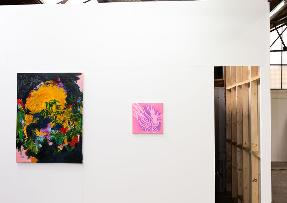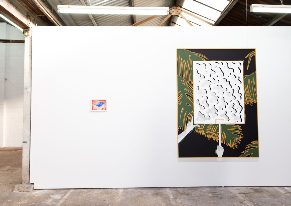 No one practice goes without an alter ego in Hot Milk. The exhibition poses binaries and heterogeneous confluences of aesthetic devices, process and conceptual framing. Lines can be drawn between the practices of Milly Peck and Hannah Tilson in their mechanistic approach to painting, the flat plane becoming extruded from the bind of the wall, proceeding forward in sculptural and site-specific terms. Formal similarities discern patterns and aesthetic cues, but the root of the artworks always encourages a reading that is immensely varied. In both artist’s work, there is a shrugging off of formal and conservative temperaments, instead, sampling more assured, confident choices of colour and of form. Peck’s works are ossified in wood, the technical rigidity of which makes them behave equally as drawings, as paintings and as sculptures. This definitive language of Pop and punk—particularly in Tilson’s paintings, interlaced with references to fashion, motorcycles, flamboyant style, flames and collage that drips with colour and verve—produces painting “in the round;” blueprint-like diagrams of cinematic, geometric form.